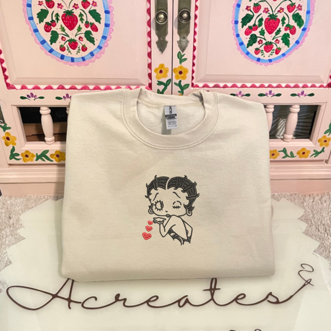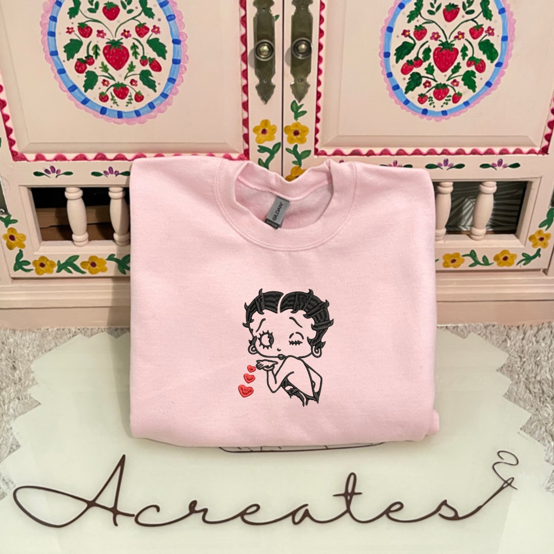 Get ready to pucker up for style with the Betty Boop Kisses Crewneck. Featuring the iconic cartoon character, this crewneck adds a touch of playful nostalgia to any outfit. Made with high-quality materials, it's not only stylish but also comfortable to wear. (No need to steal kisses from strangers with this crewneck around!)